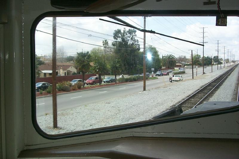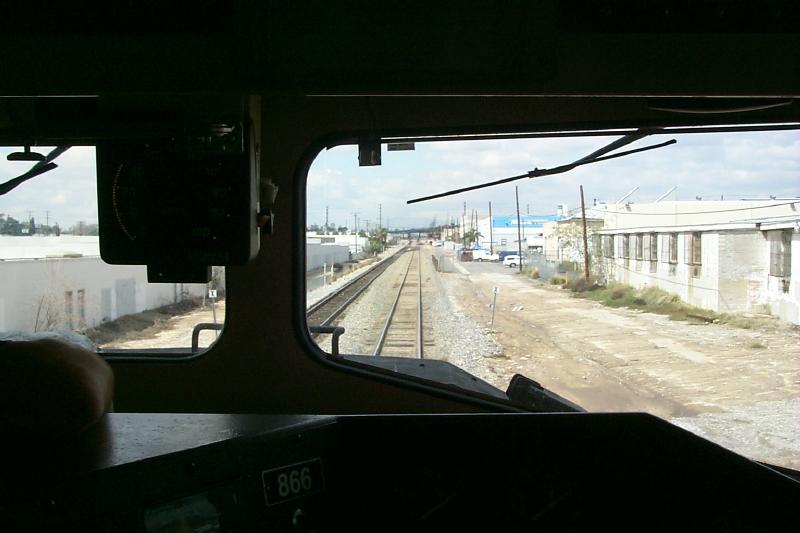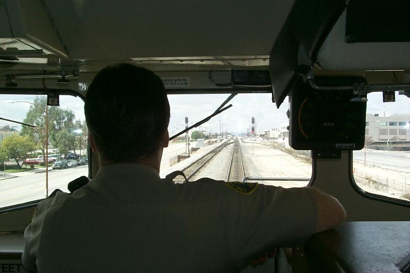 Taking his seat at the controls of the train in the Cab Car, Metrolink Engineer Ralph Magellan calls the dispatcher for clearance. The "High Ball" order is given and off we go for our final trip. |