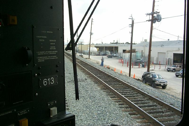 Burbank Lt. Walker views the traffic ahead from the Cab window of #613. Another crossing ahead and this time all is clear again. |