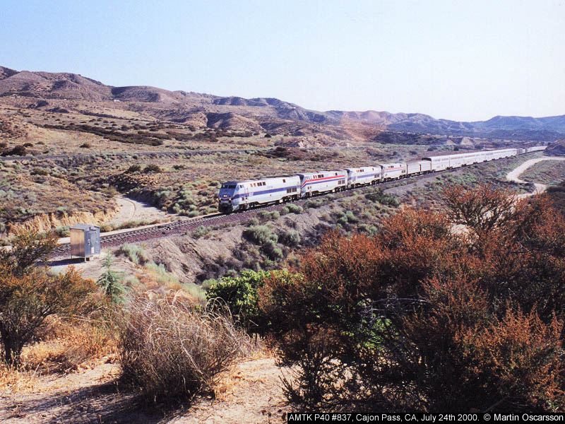 837 Amtrak P40 #837, P42 #19, #52 and #41 with the westbound Southwest Chief running about 2 hours 40 minutes late. Photo taken from Hill 582, Cajon Pass, CA, July 24th 2000. |