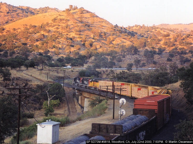 SP SD70M #9818 leads an eastbound train out of Woodford, CA, heading for the Tehachapi Loop in the evening of July 22nd 2000.