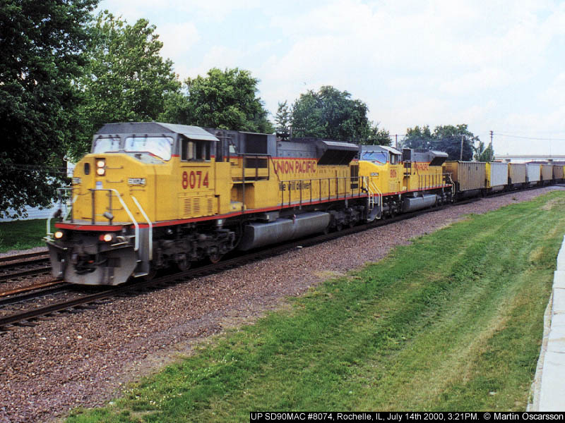 UP SD90MAC #8197 and C60-AC #7026 with a westbound train at Rochelle, IL,
