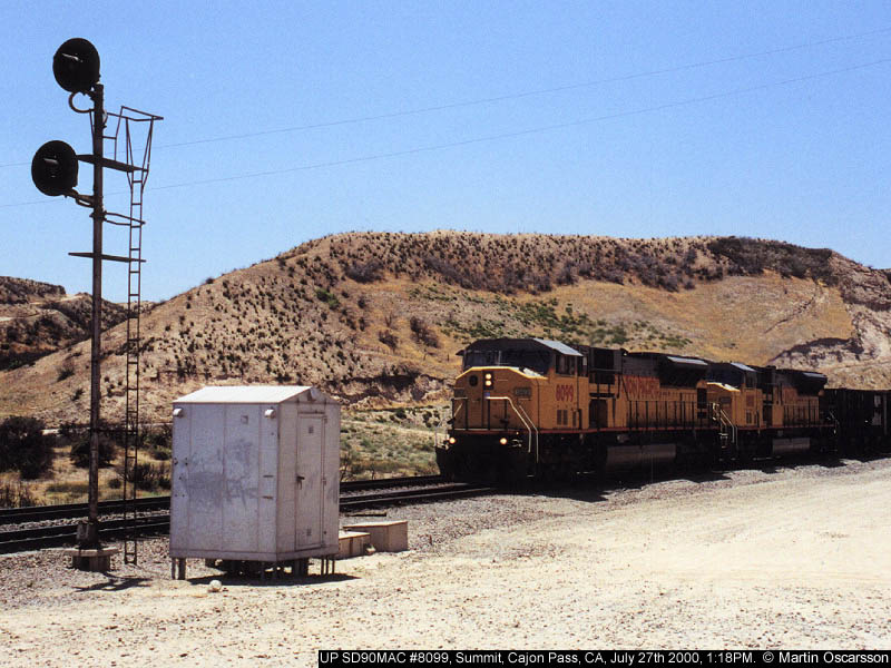 UP SD90MAC's #8099 and #8100 leads an eastbound coal train at Summit, Cajon