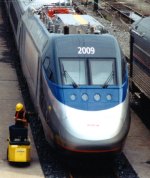 -Click here for a close, top view of Amtrak Acela HSEL (High-Speed Electric Locomotive, rated at 6250 H.P) #2009. The Acela Express Trainset is being set up for testing at Penn Coach Yard, Philadelphia, Pennsylvania. 8/4/00.