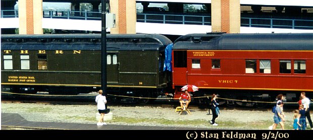 Click here for a closer look at restored Railway Post Office Car (RPO) #6, with Private Pullman Business Car Kitchi Gammi Club (VIRC 7). The cars are part of The Celebrate The Century Express at Steamtown National Historic Site, Scranton Pa. 9/2/00.| Search Stan's RailPix ! |