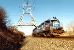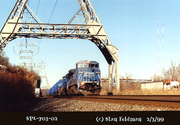 -Click here to see Conrail Train SPL-703-02 near Pencoyd on the ex-Reading Company Harrisburg Line. It is headed for Eddystone, PA. with Conrail C40-8W #6116 and Conrail SD60I #5584. The train consisted of two idler cars and sixteen export locomotives that were built by General Electric in Erie, PA. and are destined for Brazil. 2/3/99.