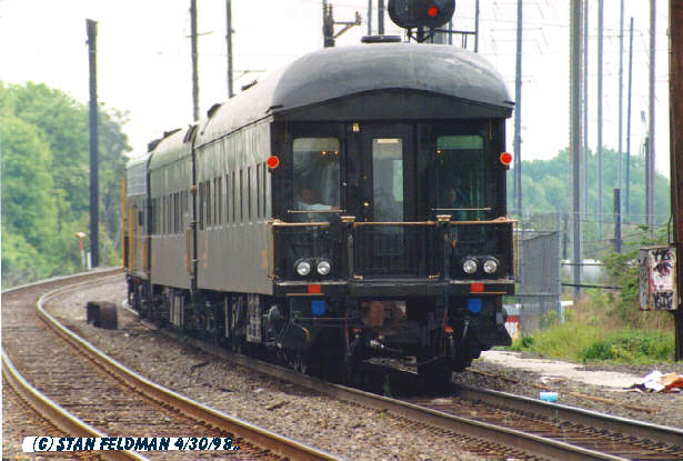 Click here to see Conrail Track Inspection Car #9, built by Pullman Standard in 1954. This car, former VIA #428, is at the rear of OCS-101-06 as it heads north past Holmesburg Junction on Amtrak in Phila Pa. 5/6/98.| Click here to Search Stan's RailPix ! |