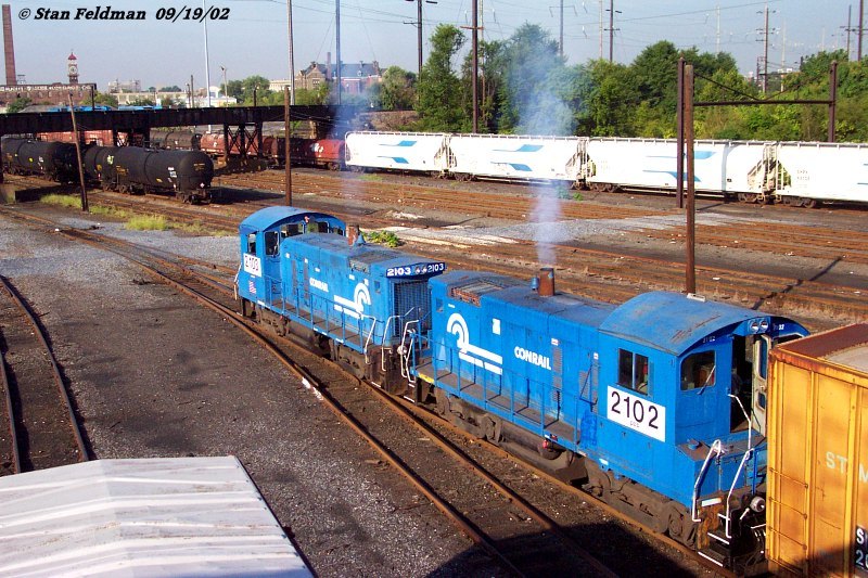 -Click here to see former Conrail SW-1001's PRR # 2102 and PRR # 2103 (Norfolk Southern), working hard at the Frankford Junction Yard in Philadelphia Penna. These 2 SW1001,s were built by EMD in 1973. 9/19/02.