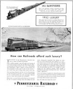 -Click here to see a 1952 Pennsylvania Railroad Ad called, "How can Railroads afford such luxury" ? It features a PRR GG1 and 18 cars that cost $3,220,000.00 , and were used on the Morning and Afternoon Congressionals. March 17 1952.