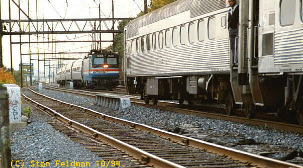 Click here to see a stopped Septa R-7 Trenton Train, being passed by a northbound Metroliner at Tacony Station, Phila. Pa. This happens many times every day on the busy Northeast Corridor. If you are foolish enought to try and cross the tracks, BEWARE ! 10/94| Click here to Search Stan's RailPix ! |