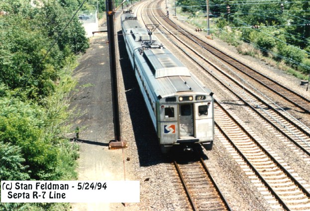 Click here to see an overhead view of Septa Silverliner #127 leading an R-7 Trenton line train. It is running west (south) having just stopped at the Torresdale Station. 5/24/94.