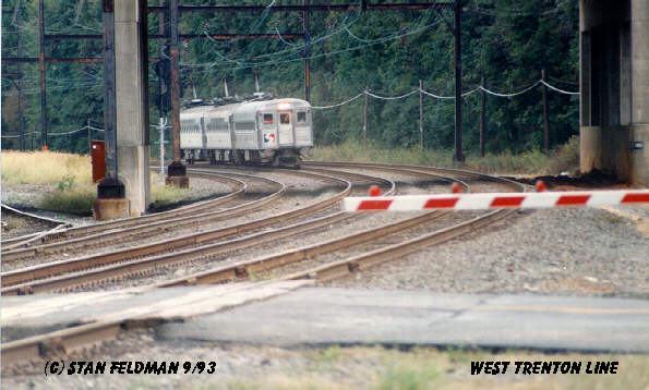 Click here to see a Septa R-3 West Trenton Train approaching The Ayres Junction crossing. This is where the Newtown Line, (no longer in service) crossed the West Trenton Line. The crossing and the Newtown Line are gone. 5/82.