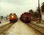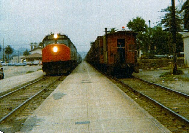 Amtrak #14 meeting a freight in Santa Barbara; notice the caboose on the freight! Taken in Summer of 1979.