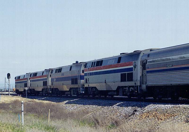 | (40K) June 14, 2001, Amtrak boxcars are now showing in Phase V paint to match the locomotives. |