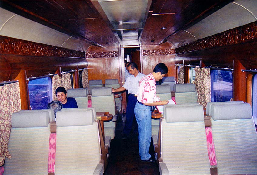 The interior view of the dining car. Looks nice, isn't it? The person who wore red-white shirt is Mr. Widoyoko, the chief of Indonesian Railway Preservation Society. |