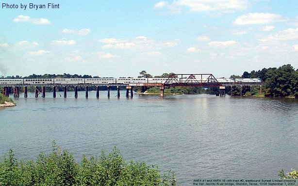 Amtrak train # 2, the eastbound Sunset Limited , crosses the San Jacinto River in Sheldon, Texas on September 7, 2003.