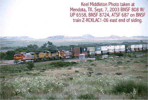 BNSF westbound train ZKCKLAC1-06 passes the east end of Mendota siding on the BNSF Panhandle Subdivision on September 7, 2003.