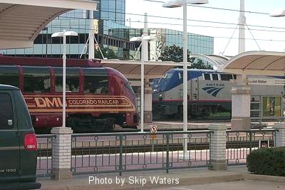After display in Frisco on September 7, the Colorado Railcar DMU headed south to Dallas Union Station. Here, the DMU greets Amtrak train 22, the eastbound Texas Eagle , as it arrives in Dallas to begin its station work.