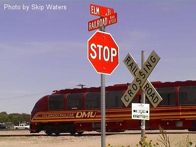 Skip Waters photographed Colorado Railcar's DMU in Frisco at the intersection of Elm and Railroad on September 7, 2003.