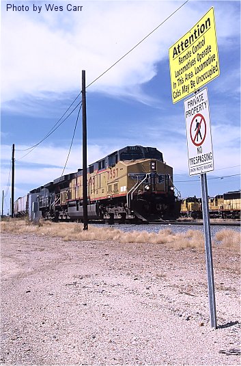 UP train MFWNP (Fort Worth - North Platte, NE) departs UP's Centennial Yard in Fort Worth at 12:10 pm on September 7, 2003.