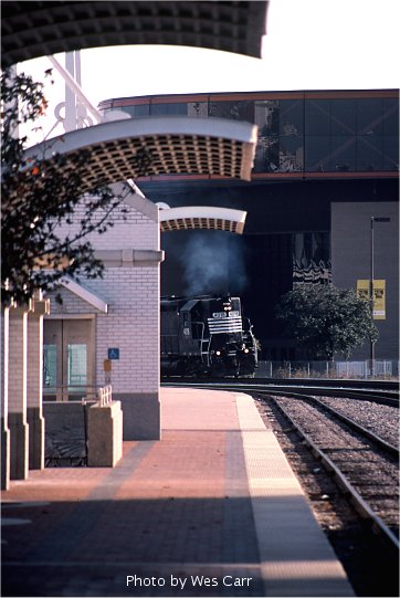 A Dallas, Garland & Northeastern switch engine approaches the platforms at Dallas Union Station. |
