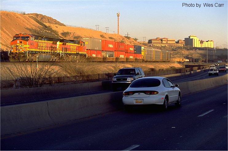 BNSF train M ELPBEL departs El Paso on a March 2002 evening. A portion of the
