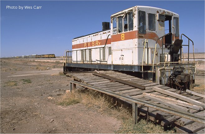 passes dormant Pecos Valley Southern GE 70-tonner # 8 at Pecos, Texas in March 2002.