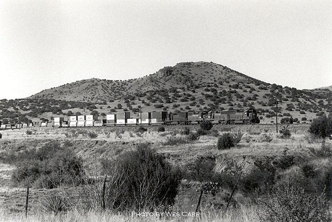An eastbound SP double stack train rolls down the east slope of Paisano Pass, between Marfa and Alpine in far west Texas. Date of photograph: November 6, 1993.
