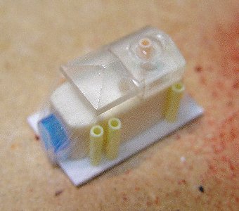 | The first step is to glue all the little bits together into something that might resemble a piece of machinery. The important thing to consider here is where things can be placed to create "elevations" in the tarp. As you can see from the picture to the right, what we have would be pretty "toy like" if we just painted it and stuck it on a flatcar. Fortunately, we have another important step to go... | FIGURE 2 |