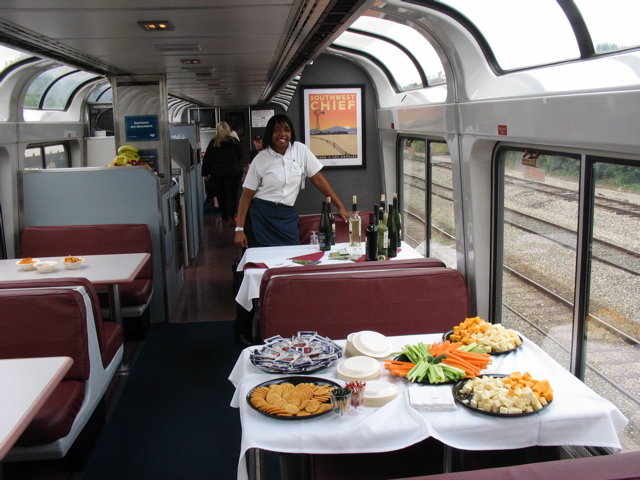 attendant at "Welcome Aboard" reception in the Sightseer Lounge car.
