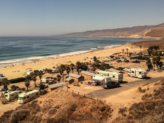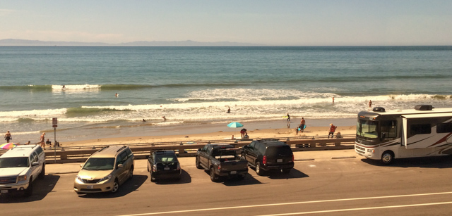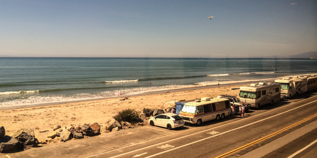 Ocean near Ventura. Campers filled the beachfront parking lot as