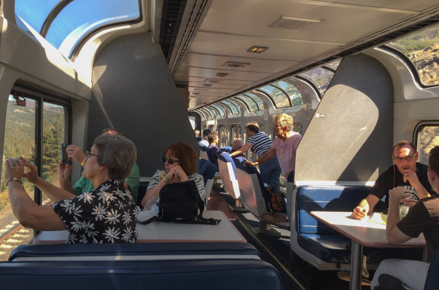 Passengers gaze at breathtaking sights from the Sightseer Lounge Car