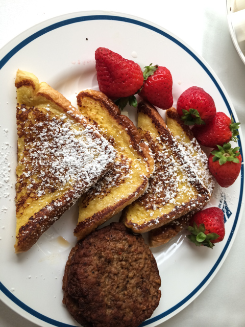 French toast and pork sausage for late breakfast on the Capitol Limited