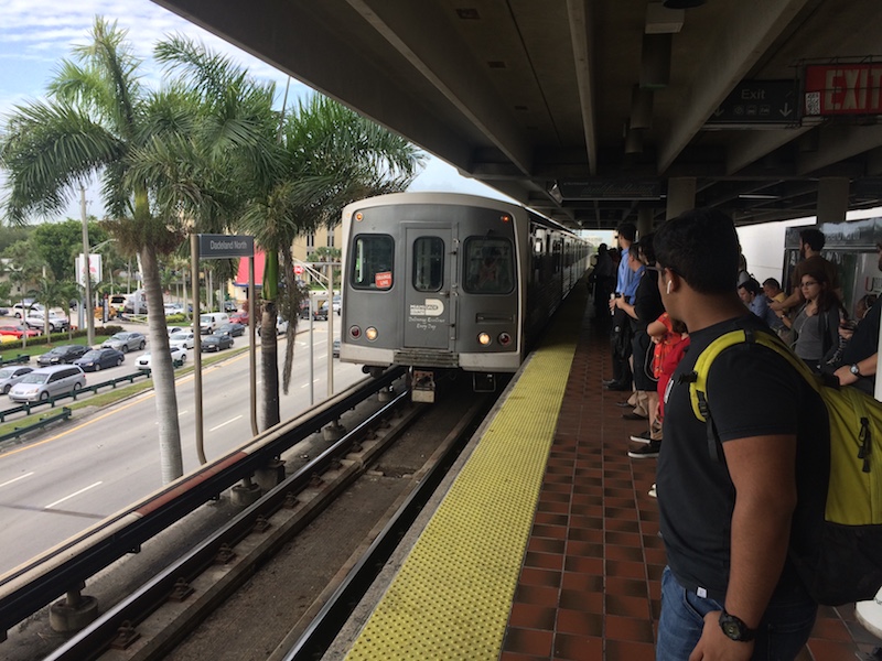 A MetroRail train arrives at Dadeland North heading to downtown Miami.