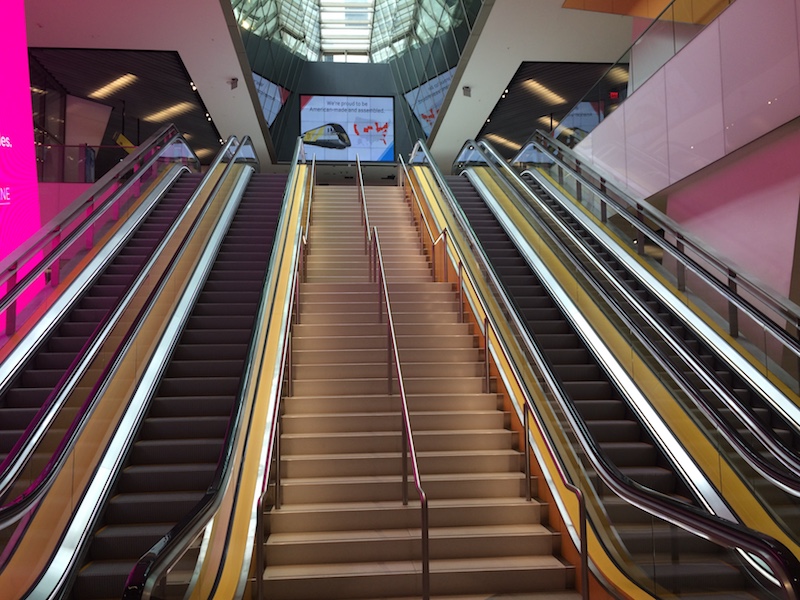Escalators from ground level to the waiting lounge of Brightline’s Miami Central Station.
