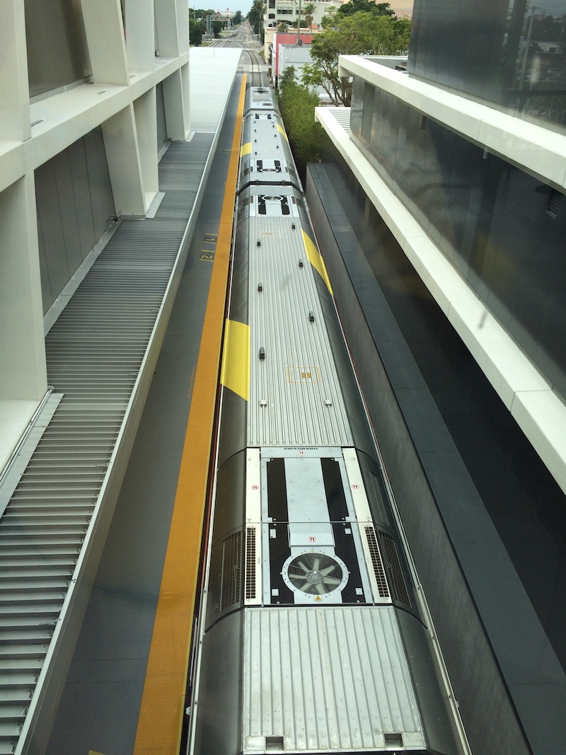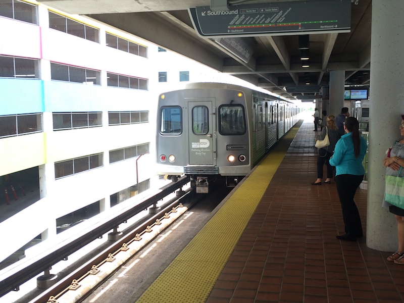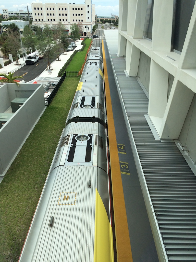 A southbound MetroRail train arrives at the Overtown station, just around the corner from Miami Central Station.