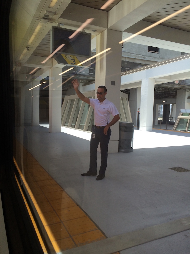 A Brightline employee waves to passengers as is done at all three stations along the route.