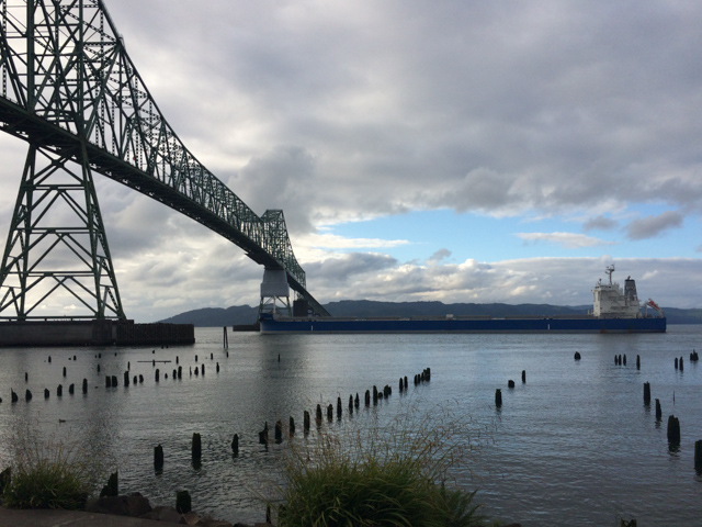 A ship passes beneath the US 101 bridge over the Columbia River at Astoria