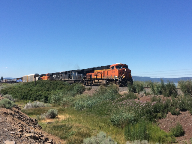 A northbound BNSF freight thunders past US 97 and Upper Klamath Lake between Modoc Point and Klamath Falls, OR