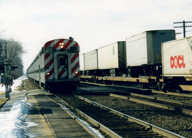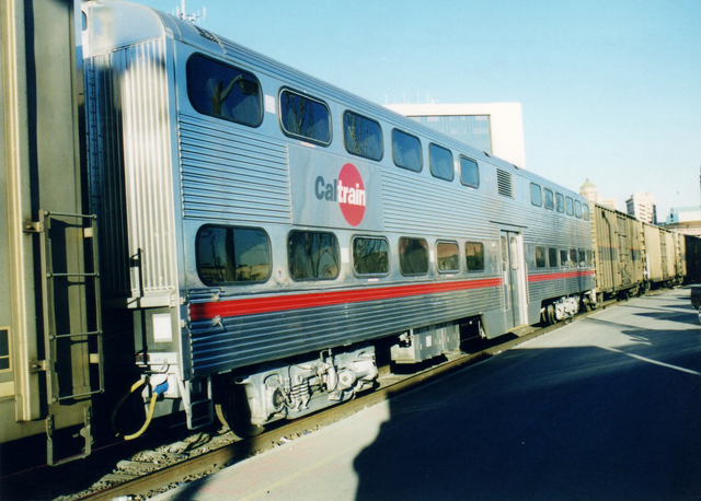 Caltrain commuter car is tucked between express cars on the westbound Sunset