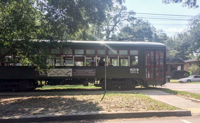 Streetcar # 904 seen from a passing automobile on Carrollton Avenue