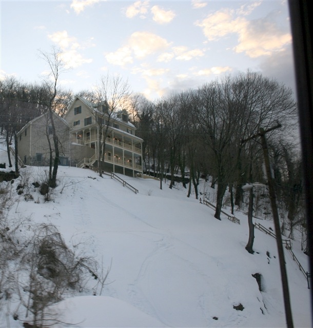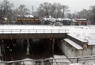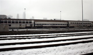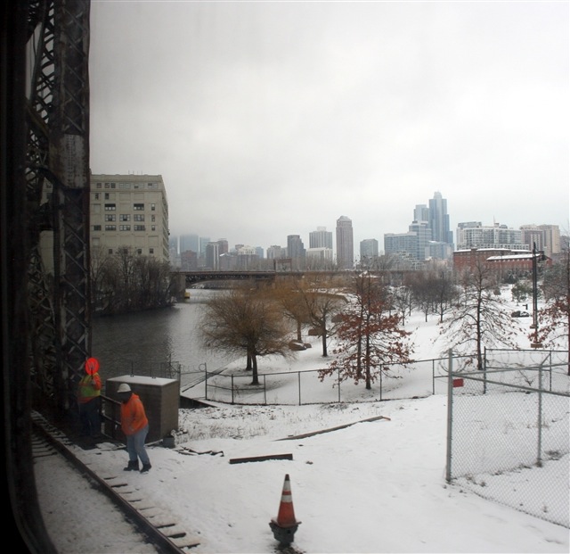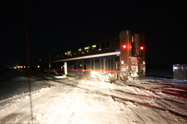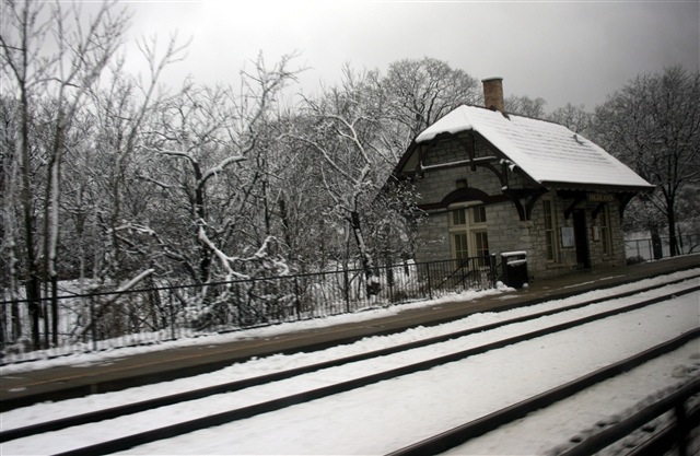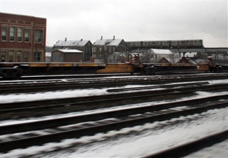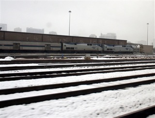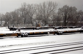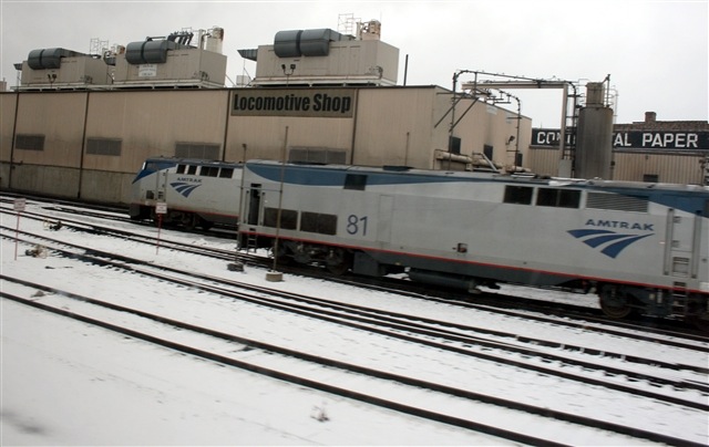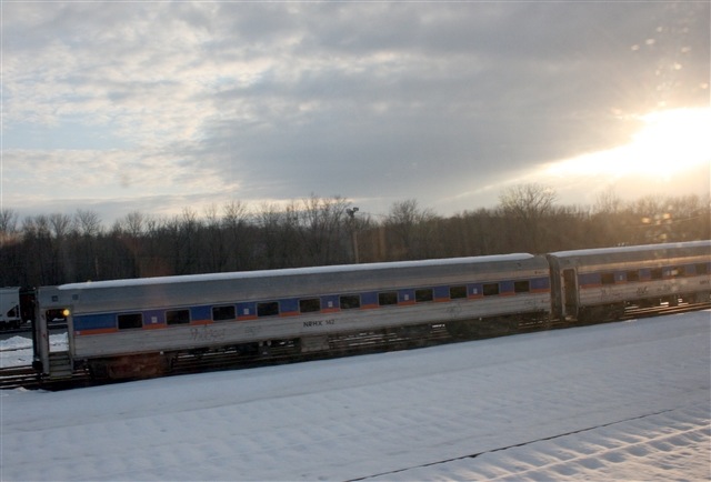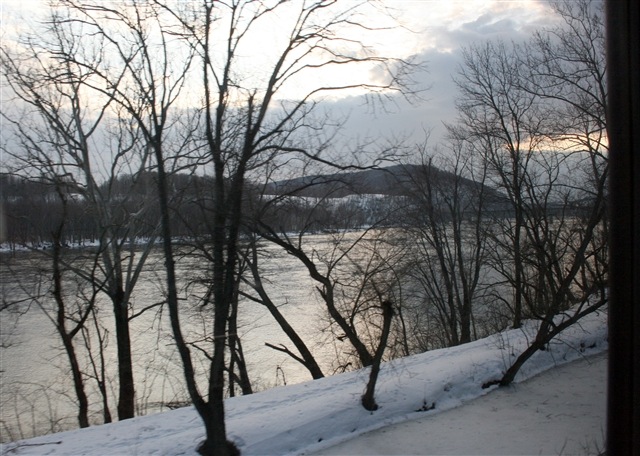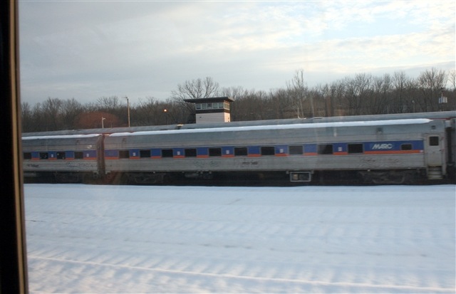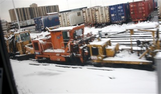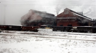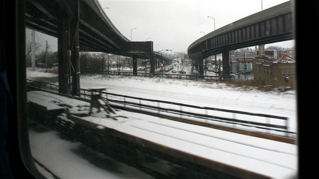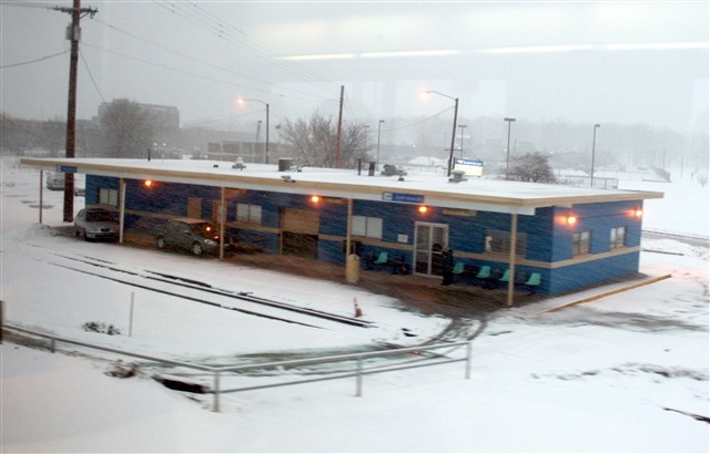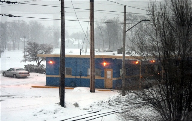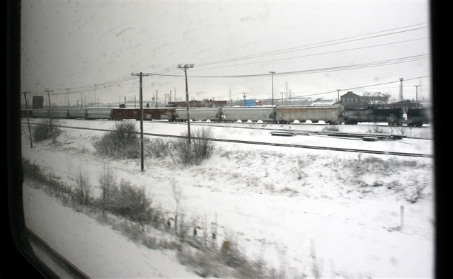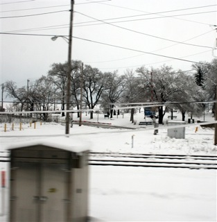 They had slept sitting in coach seats all night, so indeed they were from tough stock.  The older I get, the more I need a roomette bed.  We all enjoyed scrambled eggs, sausage patties, potatoes and biscuit along with coffee and orange juice.  I believe our Marine lady had grits with hers, a dish for which I never could acquire a taste.  After breakfast, I jumped up from the table and walked toward the middle of the car to get a window photo of the snow storm hitting South Bend, IN.
