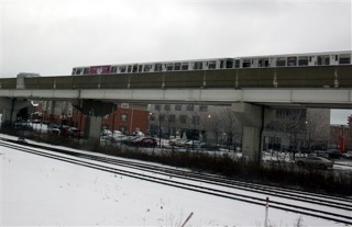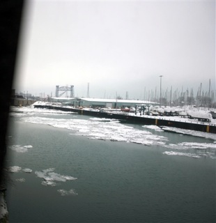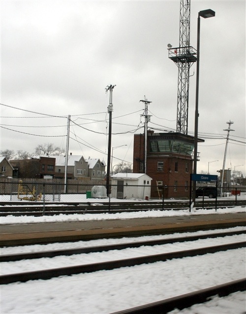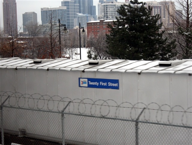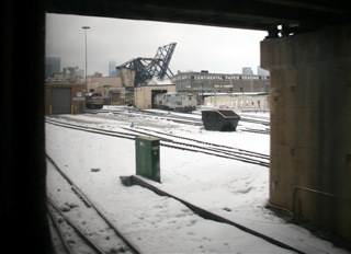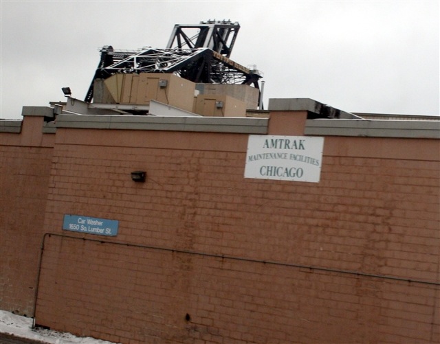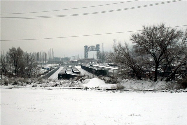 bamboo gardens and a playground.  The lift bridge we were crossing was built by the PRR in 1915.  In 2007 it was named a Chicago Landmark.  In addition to Amtrak, I believe it is also used by Metra Heritage commuter trains and NS and UP freights.  On the other side of the bridge, an Amtrak truck was plowing new snow