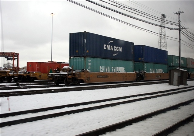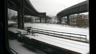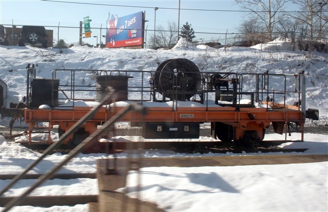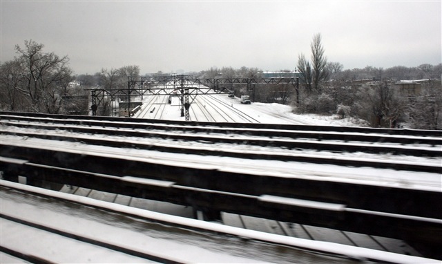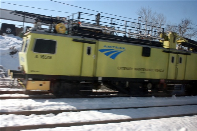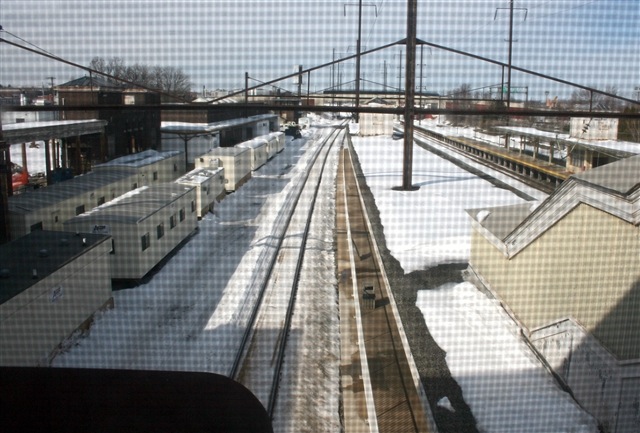 Snow removal equipment was still in evidence on the platforms due to an unusually harsh winter of heavy snow.  With the weather overcast and the landscape covered with snow most of the trip, I apologize early for the difficult photographic lighting situations of the photos.  Our train was moving pass catenary equipment,