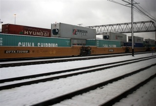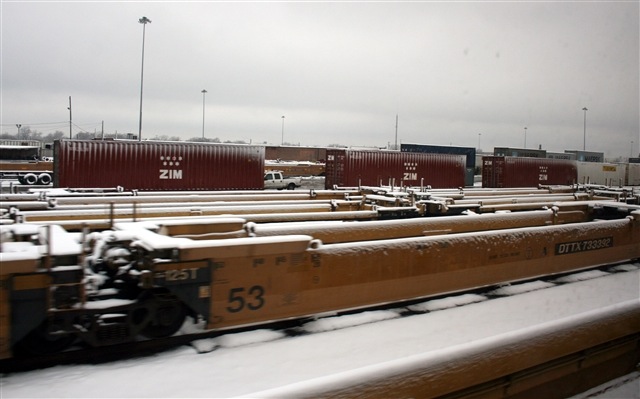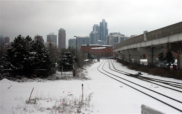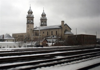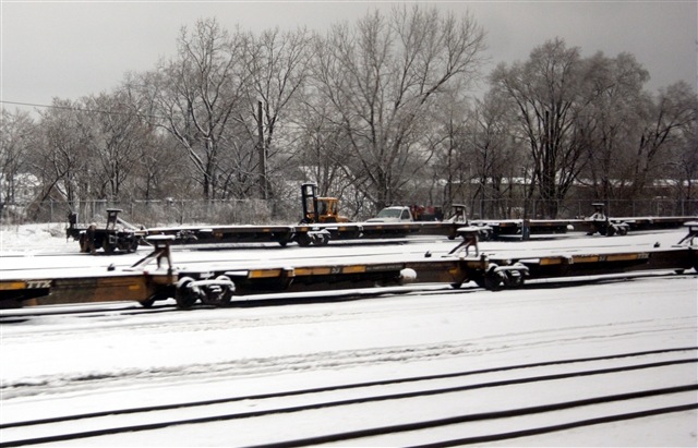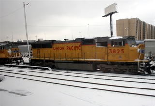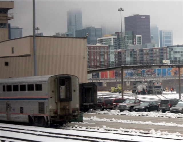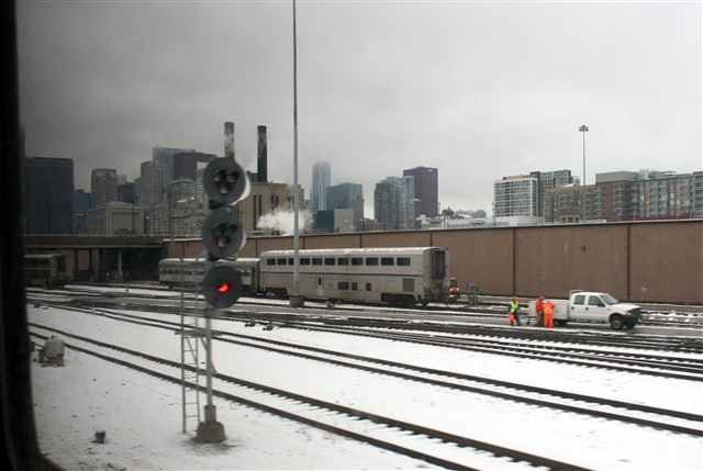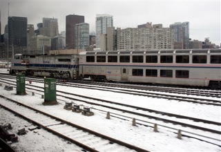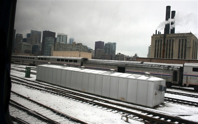 Closer to Chicago, I decided to return to my roomette to double check the suitcase for arrival.  At this point, it was a matter of staying in the roomette as we closed in on Union Station.  I donned my headphones again for CDs by The Lovin’ Spoonful and Edie Brickell.  Did you know she is married to Paul Simon?  Is he a lucky bugger or what?!  Pictures begging to be taken outside the window were a rail yard, an ice filled river, the Chicago Embassy Church, and Intermodal cars before we reached the Chicago White Sox baseball stadium.