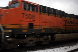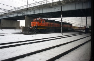 a trainman checked my ticket and assigned a seat to me.  Once we began to move, I took myself and my camera right up to the observation car.  Due to the time of year and weather, lighting for photographs would soon be limited.  Various pieces of  railroad equipment, including Amtrak and BNSF, were observed as we left the city,