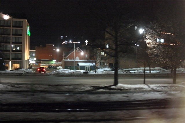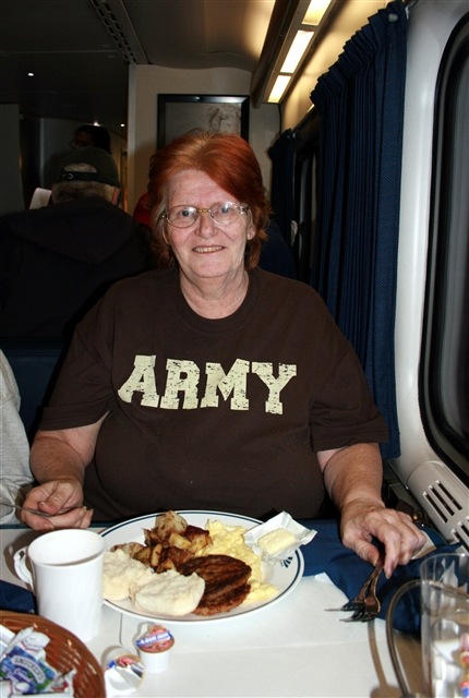 Photos of Naperville, Mendota, Princeton, Galesburg and Ft. Madison, IA will be included in Part IV on the way back home.  Midway through this part of the trip, a large man came through the sightseer taking dinner reservations.  He seemed to have a chip on his shoulder from the way he was talking to would-be diners.  As he came to me I asked if the Angus burger was available and he snapped “no, that’s because it is for lunch”, and kept walking past me before I could reply.  If his behavior was any indication of the dining car staff on this train, I would skip it and just get a sandwich in the café.  It was a good choice as I tried their veggie burger and liked it.  The café attendant was a pleasant reversal of Mr. Rude from the dinning car.  By the time we reached Fort Madison, it was full dark,