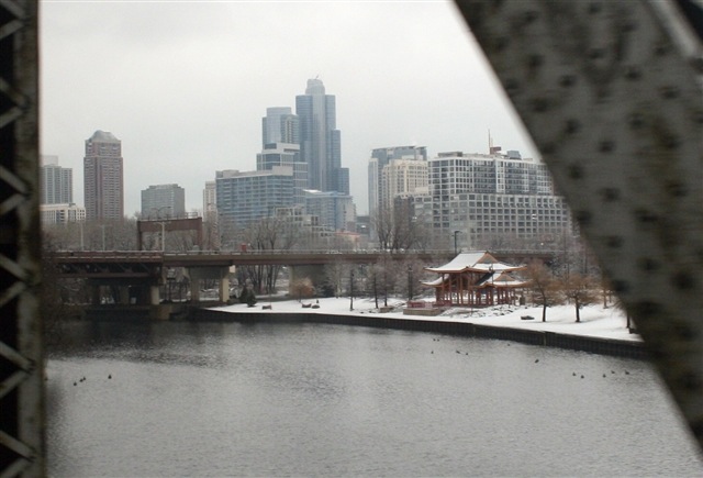 Seen off to the right side is the Ping Tom Memorial Park.  This Chinatown park on the south bank of the Chicago River was formerly a Santa Fe Railroad yard, and was purchased by the Chinese American Development Corp led by civic leader Ping Tom.  Mr. Tom worked years putting the plan together to make his dream come true.  Unfortunately, he passed away and the park is named in his honor with three sections, a pagoda pavilion,