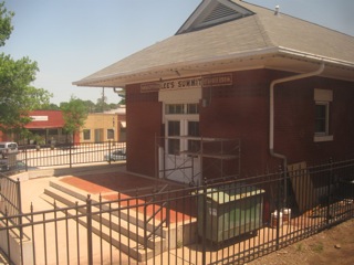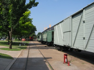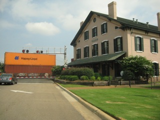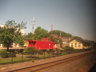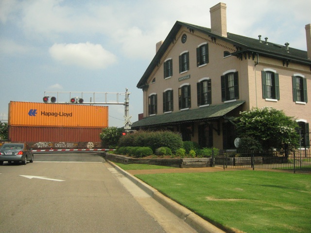 A Norfolk Southern freight train en route to Memphis breezes past the Huntsville depot |