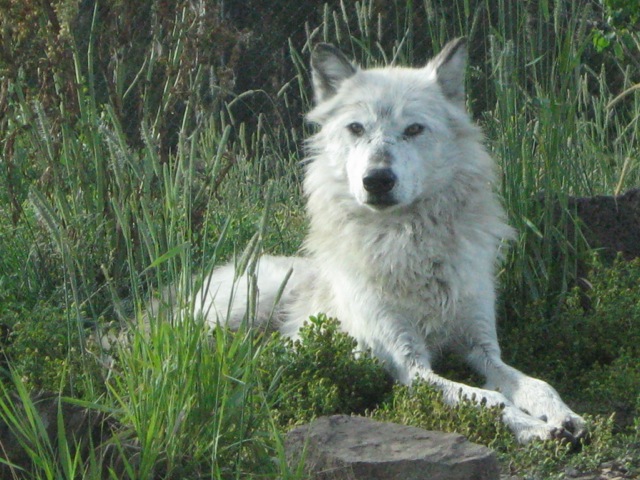 A white wolf at the Grizzly & Wolf Discovery Center in West Yellowstone, Montana