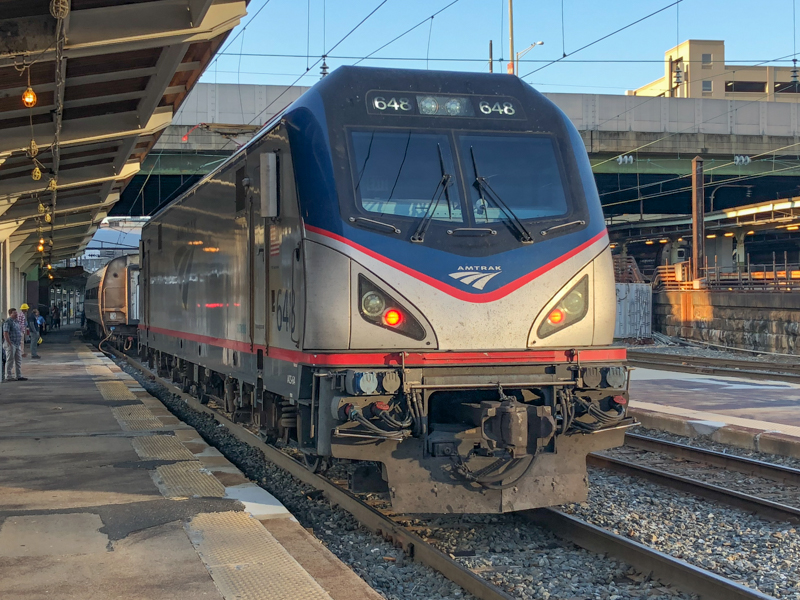 ACS64 electric engine # 648 is added to the head end of the Silver Meteor in Washington